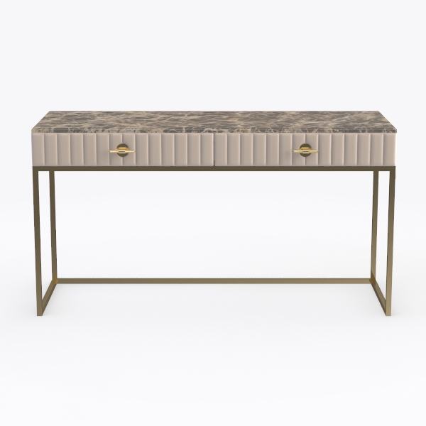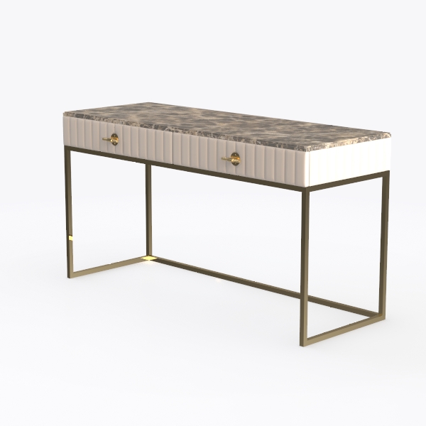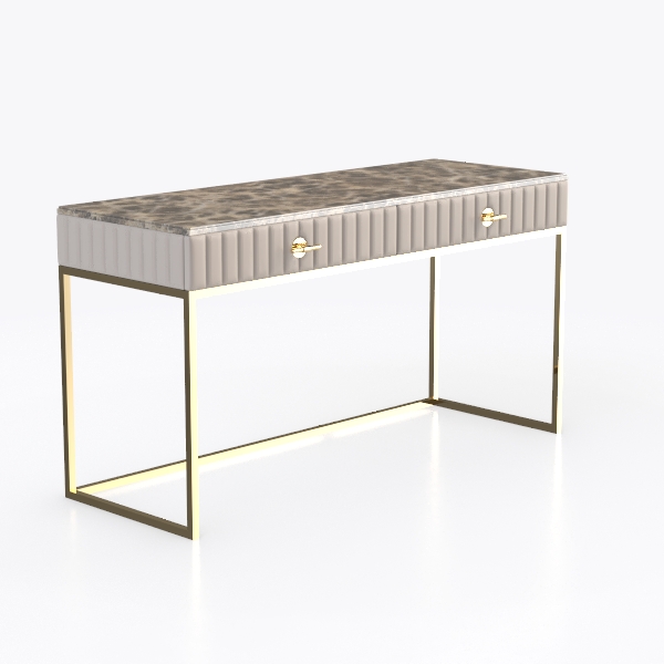Designed to blend natural stone's organic allure with sleek metallic touches, this console table features a smooth marble top (cool, tactile), soft velvet drawers with vertical stitching (gentle texture), and gold metal legs (sleek, elegant). Ideal for modern minimalist luxury entryways, it pairs beautifully with marble coffee tables and metallic floor lamps. Spacious drawers with gold handles offer hidden storage, merging style and functionality seamlessly.