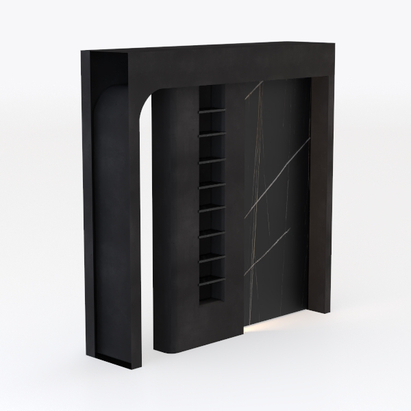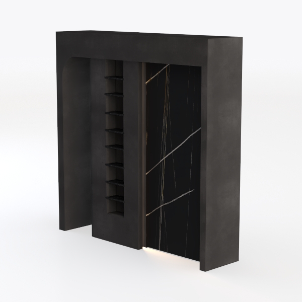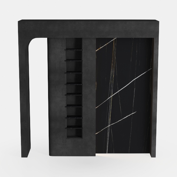 Inspired by architectural minimalism, this piece blends clean lines with organic texture. A sleek matte black frame contrasts with a glossy marble-like panel, featuring delicate white and gold veining, creating a striking visual balance. Ideal for modern minimalist living rooms or studies, it pairs beautifully with metal accents and potted plants. A row of small open shelves on one side offers display space for books or decor, while a closed cabinet on the other ensures hidden storage, balancing style and functionality.