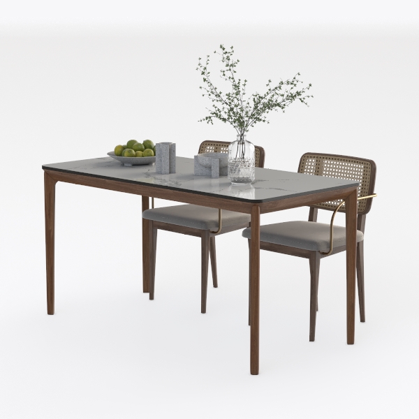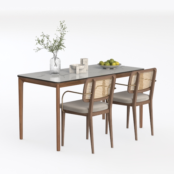 Inspired by the harmony of natural textures and clean, contemporary lines, this dining set merges simplicity with warmth. The tabletop features a smooth, polished surface with delicate marble-like veining, offering a cool, tactile contrast to the warm, grainy texture of the solid wood legs—richly hued and subtly rough to the touch, they ground the piece with earthy charm. Visually, it feels light and airy, with the soft white of the tabletop balancing the depth of the wood, while the woven rattan chair backs add artisanal detail, creating a blend of modern elegance and organic coziness.