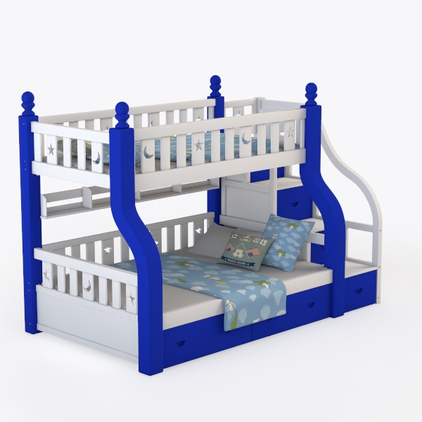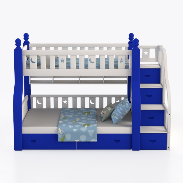 Inspired by celestial themes, playful star and moon motifs, this blue and white bunk bed features smooth, polished wood frames. Soft, cozy cloud-patterned beddings add warmth to the crisp palette, with sturdy guardrails and sloped steps ensuring safety. Perfect for whimsical kids' rooms, pair with pastels and fairy lights, plus spacious under-bed drawers for ample storage.