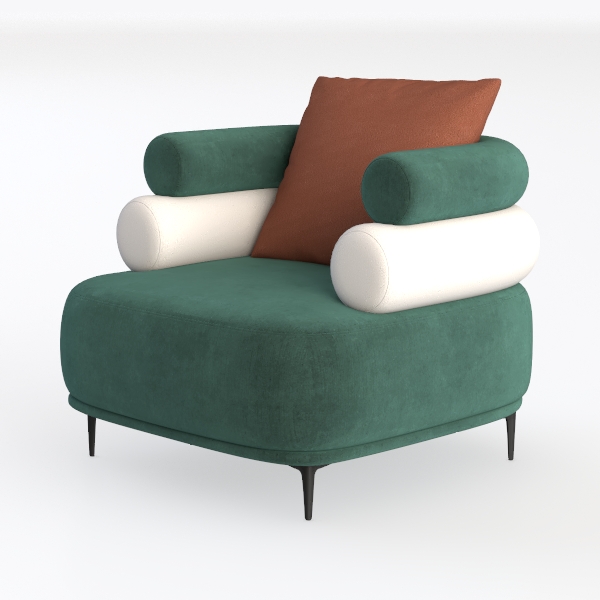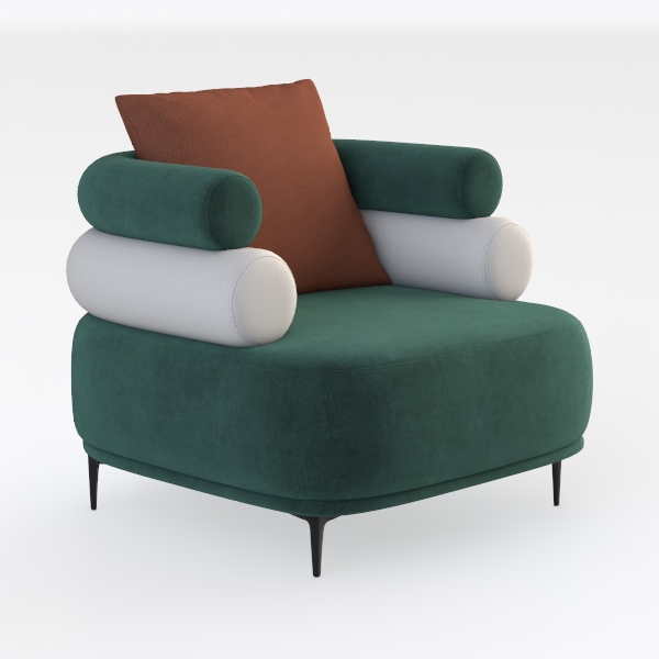 This armchair draws inspiration from a blend of mid-century modern warmth and contemporary minimalism, balancing nostalgic comfort with sleek, uncluttered lines. Its plush, deep emerald-green upholstery features a soft, velvety texture that invites immediate relaxation—like sinking into a cloud—while the curved, cylindrical armrests, wrapped in crisp white fabric, add a playful contrast, creating visual lightness against the rich green base. A textured terracotta cushion rests gently on the seat, its warm hue complementing the chair’s organic shape and enhancing the overall cozy yet polished feel.