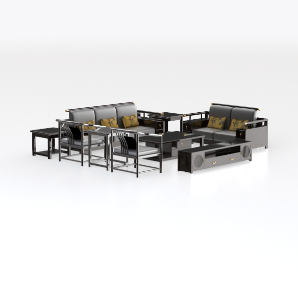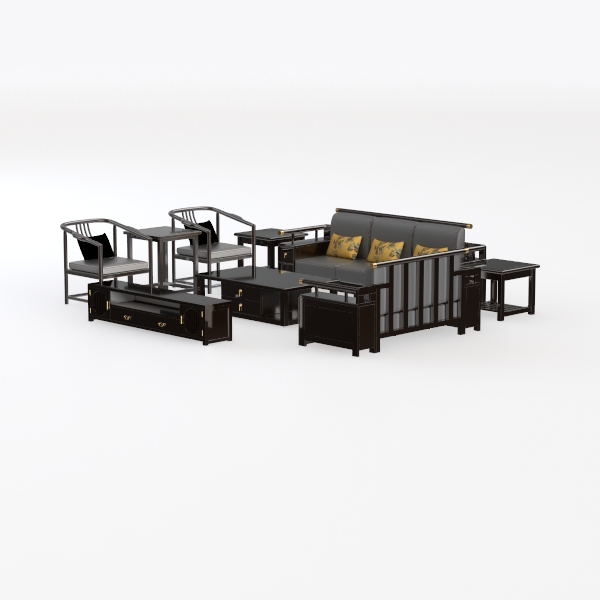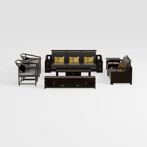 This elegant living room set draws inspiration from traditional East Asian furniture design, merging classic craftsmanship with modern minimalism. The solid wood frame boasts smooth, sanded surfaces with a warm, matte finish—tactile and inviting, while the upholstered sofa and armchairs feature soft, breathable fabric. Deep, rich black hues dominate, accented by vibrant yellow floral-patterned cushions that add subtle, lively contrast. Visually, the set radiates understated luxury: clean lines and symmetrical arrangement, with delicate gold metal trim on armrests and drawer pulls enhancing its timeless allure.