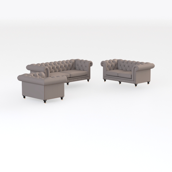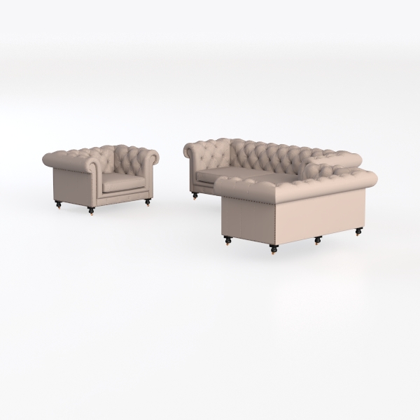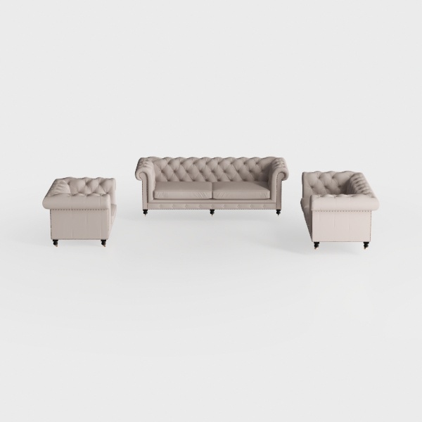 Echoing the timeless charm of classic Chesterfield designs, this living room set marries traditional elegance with modern comfort. The soft, warm taupe upholstery feels luxuriously smooth to the touch, while the intricate button-tufted details add subtle texture and depth, catching light gently to create a sophisticated visual rhythm. Curved arms and slim black legs frame a clean, uncluttered silhouette, balancing softness with a touch of sharpness.