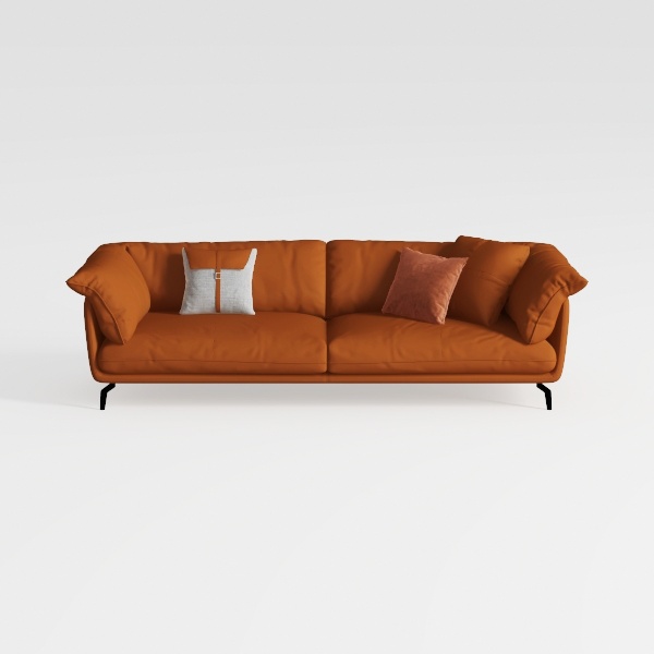 This sofa radiates a harmonious blend of organic warmth and contemporary minimalism, with design roots in the earthy, sun-kissed hues of a fall landscape. Its rich terracotta-orange upholstery, with a soft, velvety texture, feels luxuriously tactile—plush yet not overly heavy, inviting you to sink in and relax. The clean, unadorned lines of its backrest and gently curved armrests emphasize a calm, uncluttered aesthetic, while the slim black metal legs add a light, airy contrast, keeping the piece from feeling bulky.