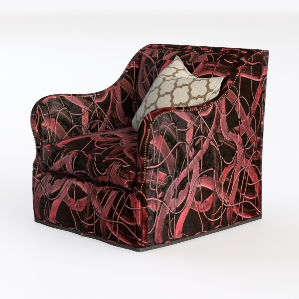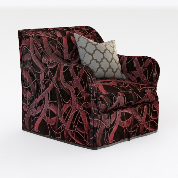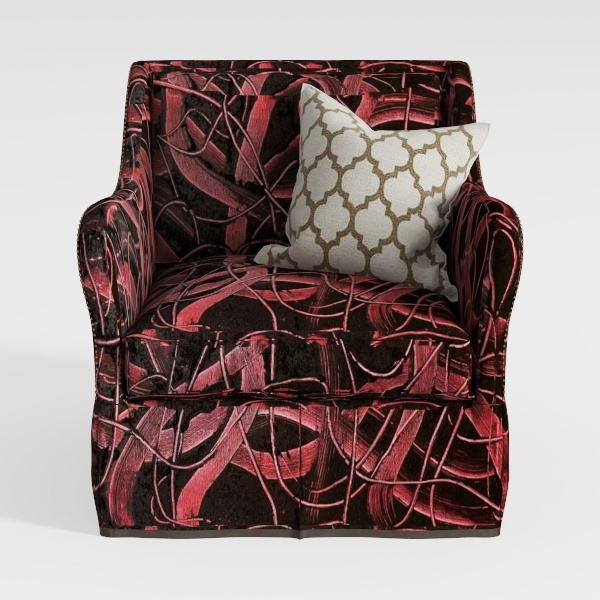 Drawing inspiration from abstract expressionism, the chair’s bold, fluid patterns evoke the dynamic energy of sweeping brushstrokes, blending structured lines with organic movement. Crafted with a plush, velvety texture, the fabric catches light subtly, enhancing the rich interplay of deep burgundy and inky black. The abstract design—winding, intertwining lines—creates a visual rhythm that draws the eye, while the soft curves of the armrests and gently sloped back add warmth to the striking aesthetic.