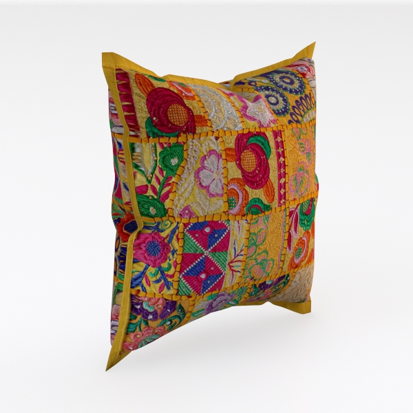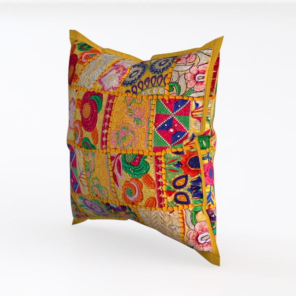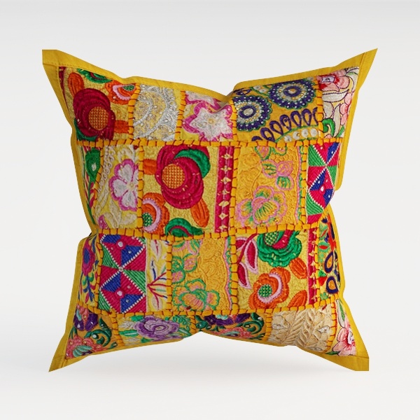 Indian Handmade Cotton Yellow Kantha Fruit Print Threads Work Cushion Cover Throw Pillow Cases Decorative Pillows Cover Bohemian 16x16 Inches