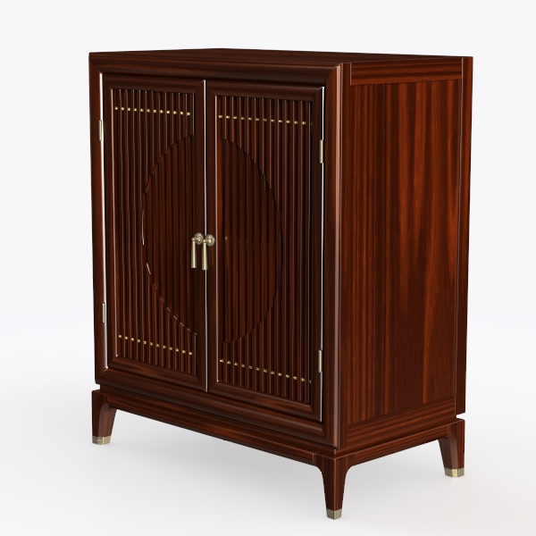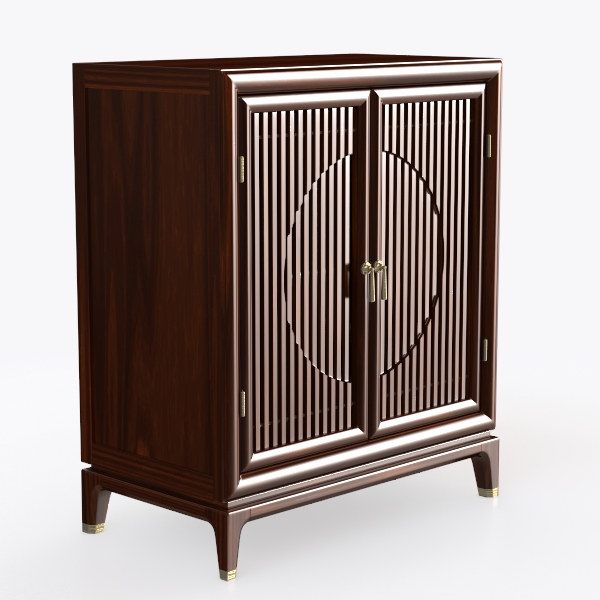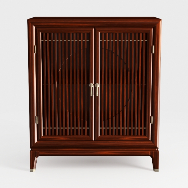 Blending traditional Asian lattice motifs with modern simplicity, this wooden cabinet features rich, warm grain and a polished finish, smooth to the touch. Vertical slats cast rhythmic shadows, enhancing depth. Ideal for a contemporary Chinese-inspired living room, pairing with marble tables and linen sofas. Spacious interior with adjustable shelves and slim tapering legs offer practical storage and lightness.