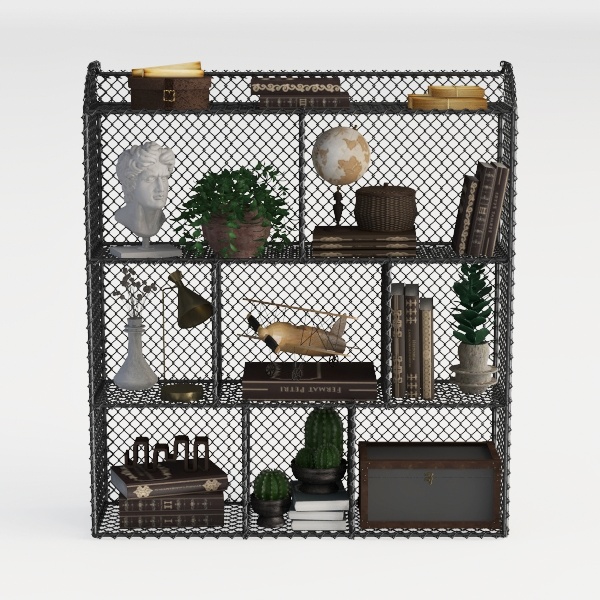This metal mesh shelf, inspired by vintage industrial storage, features a raw, textured frame blending rugged durability with warm visual appeal. Lush greenery, leather-bound books, and curated decor add depth, creating a cozy yet edgy vibe. Ideal for loft-style living rooms or home offices, it pairs beautifully with marble side tables and vintage brass accents. Its modular design organizes books, plants, and decor, maximizing vertical space while keeping the area clean and inviting.