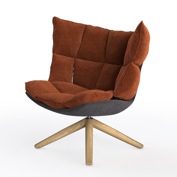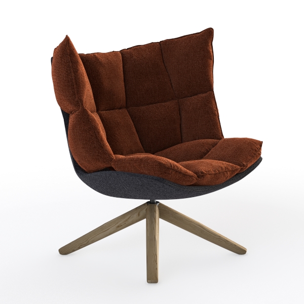 This armchair draws inspiration from the organic curves of natural shelters, like seashells or bird nests, aiming to create a sense of warmth and cozy enclosure. Its visual appeal lies in the soft, textural fabric in a rich rust-brown hue, arranged in geometric paneling that balances structure and softness. The curved silhouette wraps gently around the body, inviting relaxation, while the plush, multi-pillow design adds depth and comfort to the overall look.
