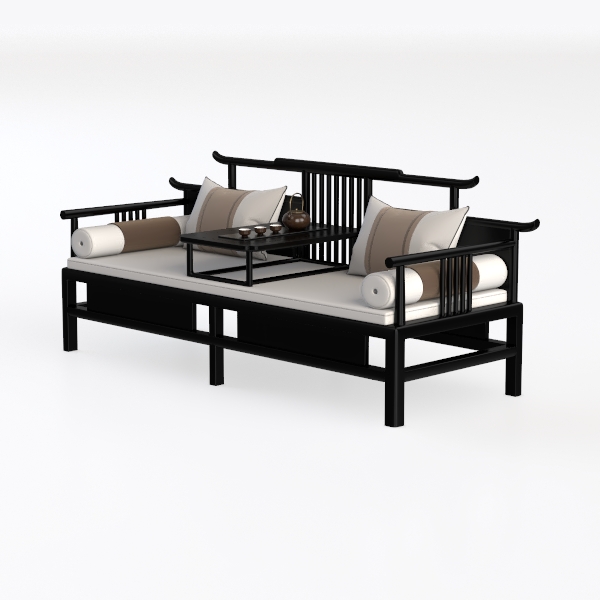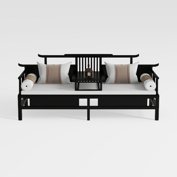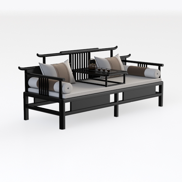 Inspired by traditional Chinese furniture, blending classic elegance with modern minimalism. Sleek black wooden frame contrasts softly with white padded cushions, while striped beige and white pillows add gentle texture, creating serene oriental charm. Ideal for a new Chinese-style living room, pairing beautifully with wooden side tables, ink-wash art, or potted greenery. Spacious seating with a central small table offers ample space for relaxation or entertaining, balancing style and practicality.