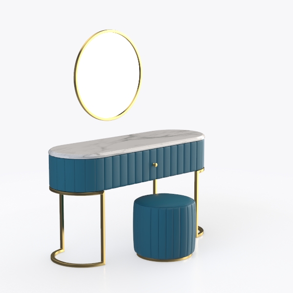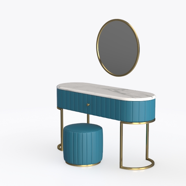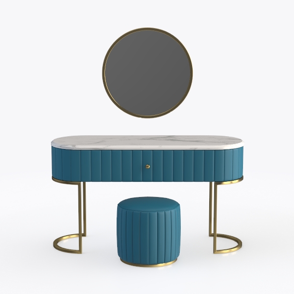 Inspired by blending modern minimalism and soft vintage charm, this vanity set crafts a serene, sophisticated beauty space. The teal upholstery’s vertical texture feels smooth and soft, while polished gold metal legs and white marble countertop add luminous contrast, elevating elegance. Perfect for modern-luxury bedrooms, it pairs with warm lighting and metallic accents, with a single drawer for storage and a matching ottoman for comfortable seating—balancing style and utility.