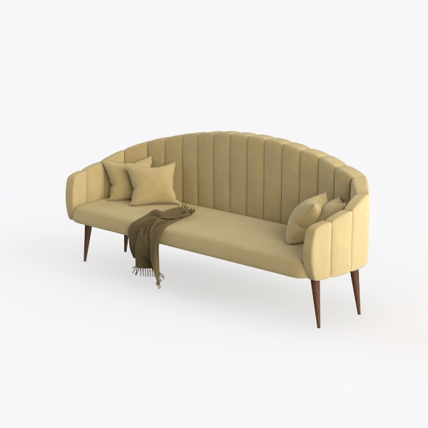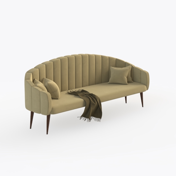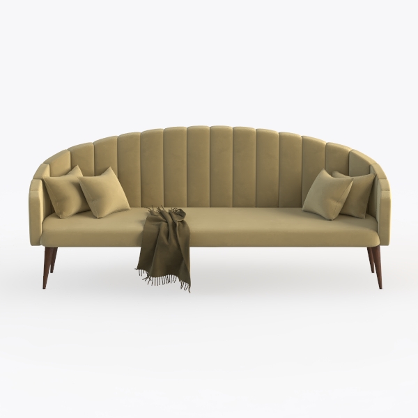Design inspiration draws from organic curves and mid-century modern charm, with its gentle, wave-like backrest evoking the soft contour of a seashell or the flowing lines of a vintage lounge piece. The warm, buttery beige upholstery feels incredibly tactile—velvety and plush to the touch, like sinking into a well-loved blanket—while the subtle vertical channel tufting adds delicate texture without overwhelming the eye. Visually, the rounded silhouette softens the room’s edges, balancing the sleek, tapered wooden legs with a sense of organic warmth that feels both timeless and fresh.
