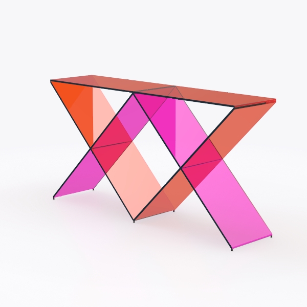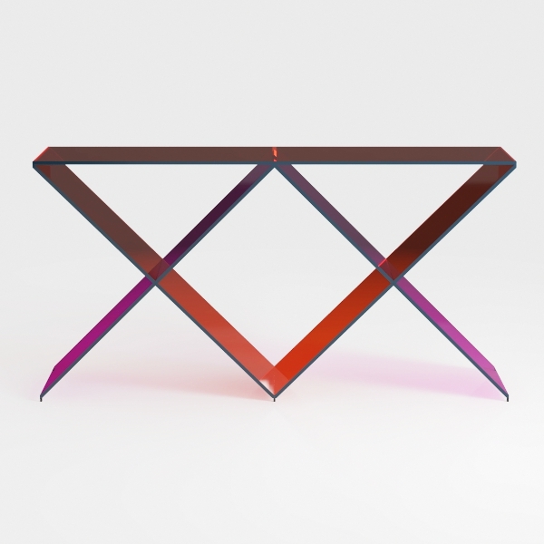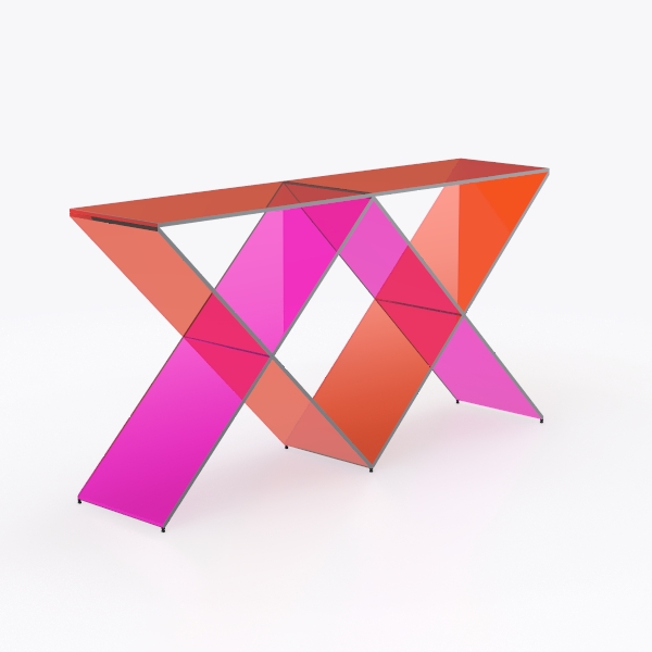 Inspired by geometric art, this table features a sleek, gradient glass surface that catches light, creating a dynamic play of red and purple hues. Its triangular frame ensures stability, while the wide, smooth top offers ample space for decor. Perfect for a minimalist living room or home office, it pairs beautifully with neutral sofas and metallic accents, blending modern elegance with functional style.
