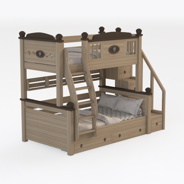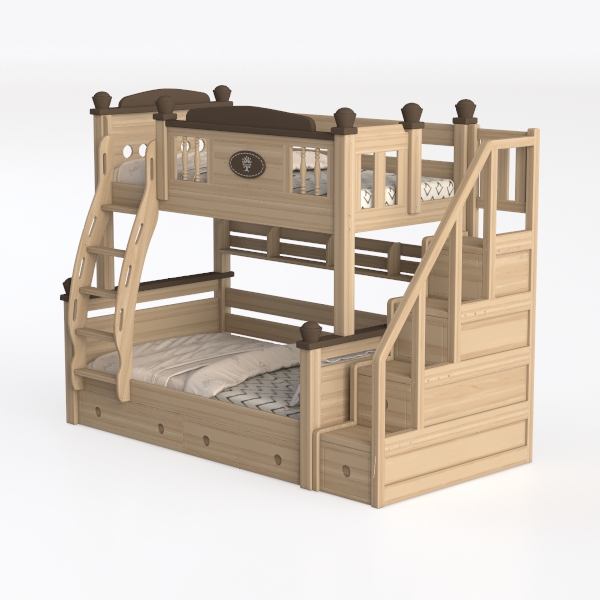 Inspired by nature’s warmth and family togetherness, this wooden bunk bed features smooth, warm wood grain with soft, rich brown accents, creating a cozy, inviting vibe. Perfect for kid’s rooms or compact family spaces, blending rustic charm with modern practicality, it has built-in drawers for ample storage and an integrated staircase to save floor space, ensuring easy access to both beds.