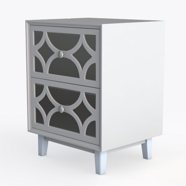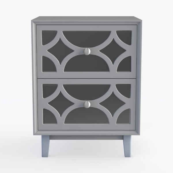 Rooted in geometric symmetry, this nightstand draws inspiration from mid-century modern aesthetics with balanced diamond and semicircle cutouts. Its smooth, matte gray finish reflects soft light, while crisp patterns add depth and subtle texture. Ideal for modern minimalist or Scandinavian bedrooms, pair it with warm wood floors, a ceramic lamp, and a potted plant. Two spacious drawers offer storage, and slender legs keep the space open.