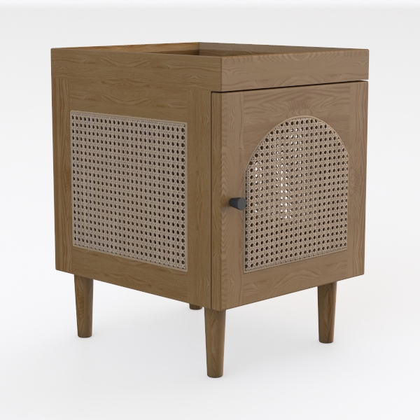 Inspired by natural craftsmanship, this wooden cabinet features warm oak tones, smooth wood surface, and intricate rattan weaves, blending softness and texture. Ideal for a minimalist or bohemian bedroom, it pairs well with linen bedding and potted plants. A single door hides storage space, while slender legs enhance its light, airy feel.