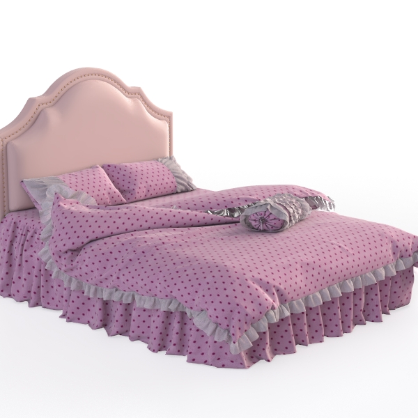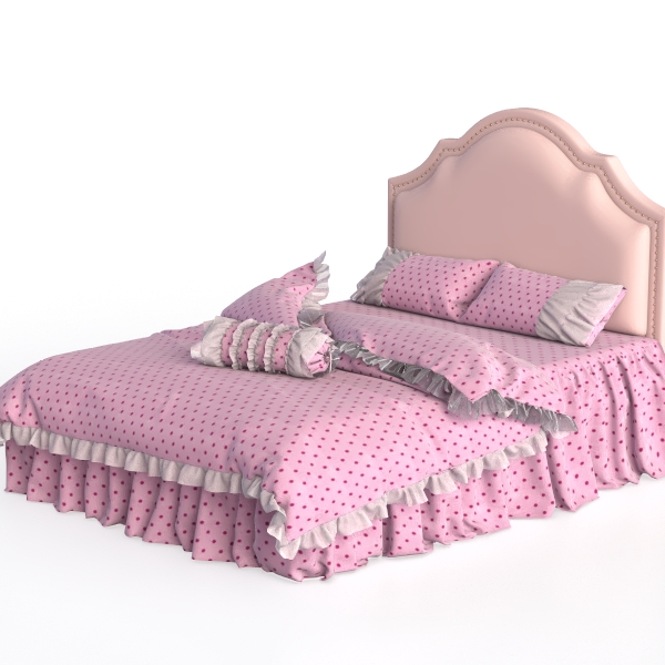 Inspired by vintage romanticism, this bed features a soft pink upholstered headboard with subtle nailhead trim, exuding timeless charm. The polka-dot quilt, with ruffled edges and delicate lace details, feels plush to the touch, creating a warm, cozy vibe. Perfect for a French country or shabby-chic bedroom, it pairs beautifully with marble nightstands and floral art, while the high headboard offers excellent back support for relaxation.