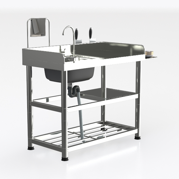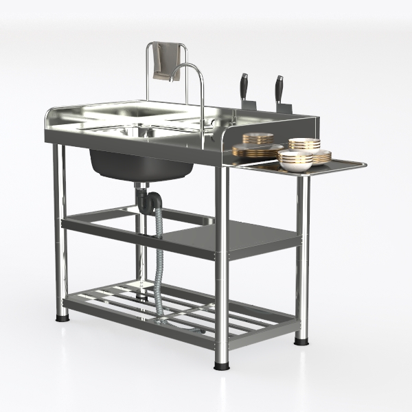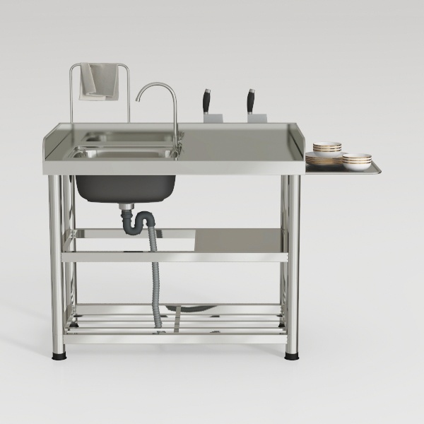 Inspired by industrial efficiency, this kitchen sink unit blends a sleek stainless steel surface—cool, solid, with clean lines—its reflective finish adding modern charm. Perfect for minimalist or industrial kitchens, paired with sleek knives and stacked bowls, lower shelves offer ample storage, ensuring smooth, organized food prep.