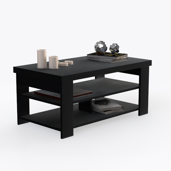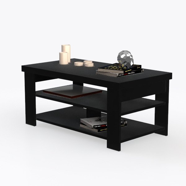 Drawing inspiration from minimalist aesthetics, this black coffee table features a sleek matte surface with a cool yet warm touch, balancing simplicity and subtle depth. Its two-tiered design offers ample space for books and decor, blending practicality with visual harmony. Ideal for a modern living room, it pairs beautifully with metallic accents like floor lamps and marble accessories, enhancing the room’s clean, sophisticated vibe.