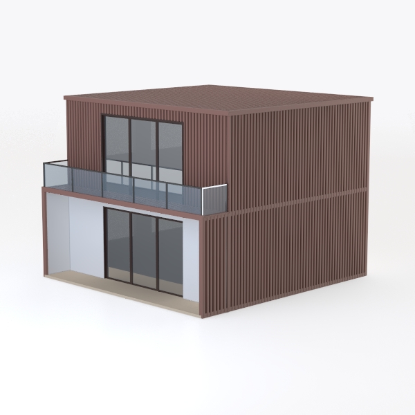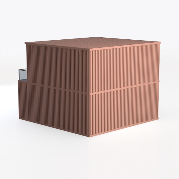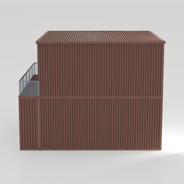 Inspired by organic, natural textures, this home features warm, earthy brown vertical slats that create a sleek, layered look. The textured surface adds depth, while clean lines exude modern minimalism. Ideal for a contemporary outdoor lounge or minimalist garden space, it pairs beautifully with natural stone accents and potted greenery. A spacious glass-balustraded balcony offers a serene retreat, and vertical slats maximize light while ensuring privacy.