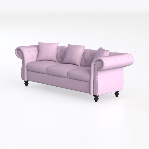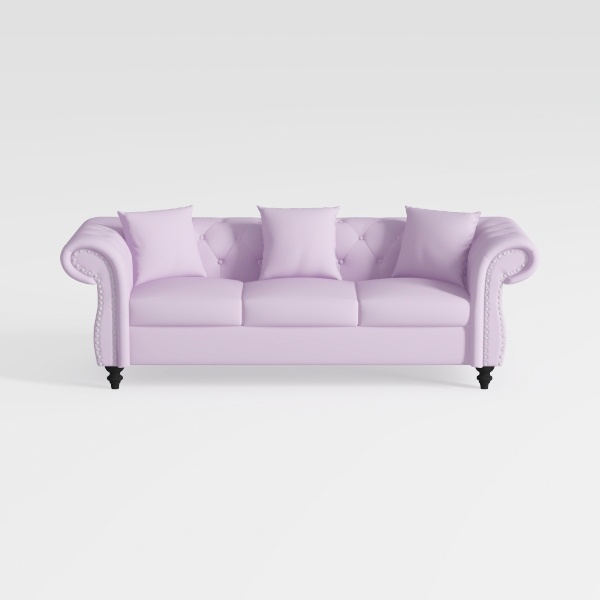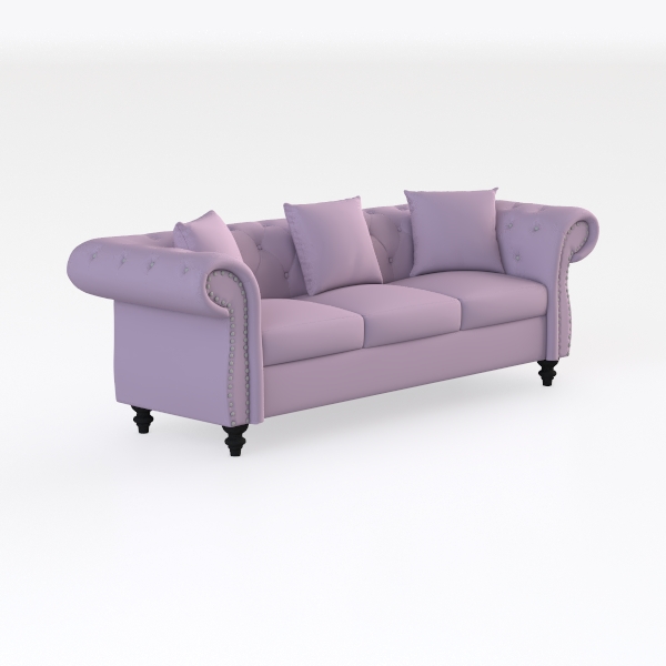 This elegant sofa blends timeless charm with modern softness, drawing inspiration from classic Chesterfield designs reimagined with a delicate, dreamy twist. Crafted in a soft lavender hue—reminiscent of blooming lilac in early spring—the upholstery feels smooth yet slightly textured, offering a gentle, cool touch that invites immediate relaxation. The button-tufted backrest, with its evenly spaced diamond pattern, adds subtle depth, while the rolled armrests curve gracefully, balancing the sofa’s structured silhouette with warm, inviting lines. Black, turned legs ground the piece, their sleek finish creating a striking contrast against the light purple fabric, enhancing both stability and modern elegance.