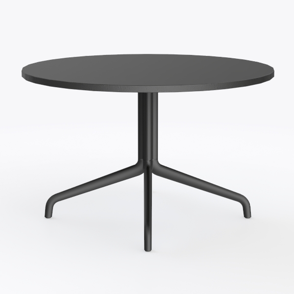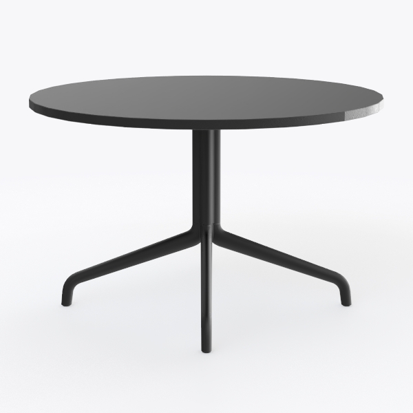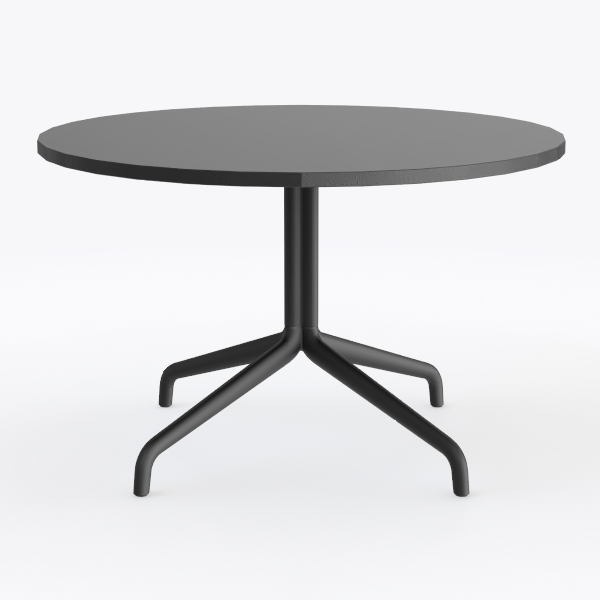 Inspired by Scandinavian minimalism and geometric precision, this sleek round table features a smooth, matte black top and angular metal legs, blending softness and structural sharpness. It elevates modern living rooms, pairing with plush sofas, textured rugs, and sculptural planters, while its generous surface and stable base offer ample space and reliability.