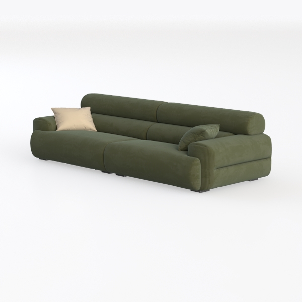 Crafted with a plush corduroy fabric, the surface feels surprisingly soft yet subtly structured, with fine ribbed textures that catch light softly. The silhouette is a masterclass in balanced curves: rounded armrests and a generously deep seat invite relaxation, while the low-profile design keeps the piece feeling open and uncluttered. Two tasteful throw pillows—one in a creamy ivory and another in a textured olive—add layers of comfort and style, enhancing the sofa’s versatile appeal.