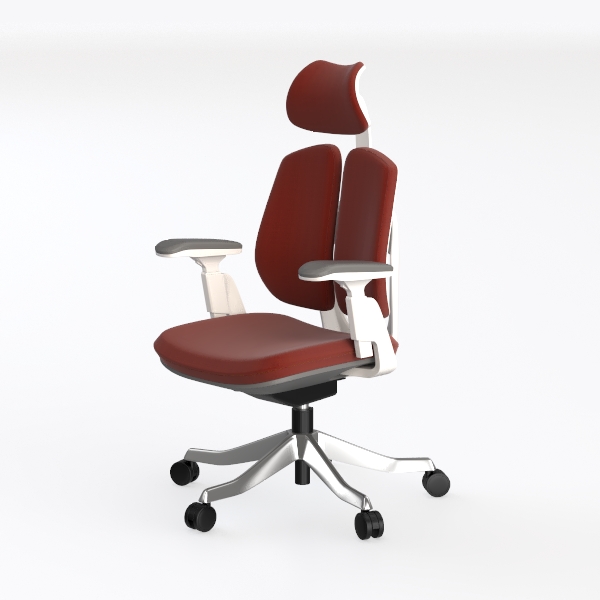 Blending ergonomic principles with sleek minimalism, this chair features soft, breathable red upholstery contrasting crisp white armrests and a polished silver base. Ideal for home offices or modern studies, pairing with minimalist desks and greenery, it offers superior lumbar support via dual-back design and integrated headrest, with smooth-rolling casters for easy movement.