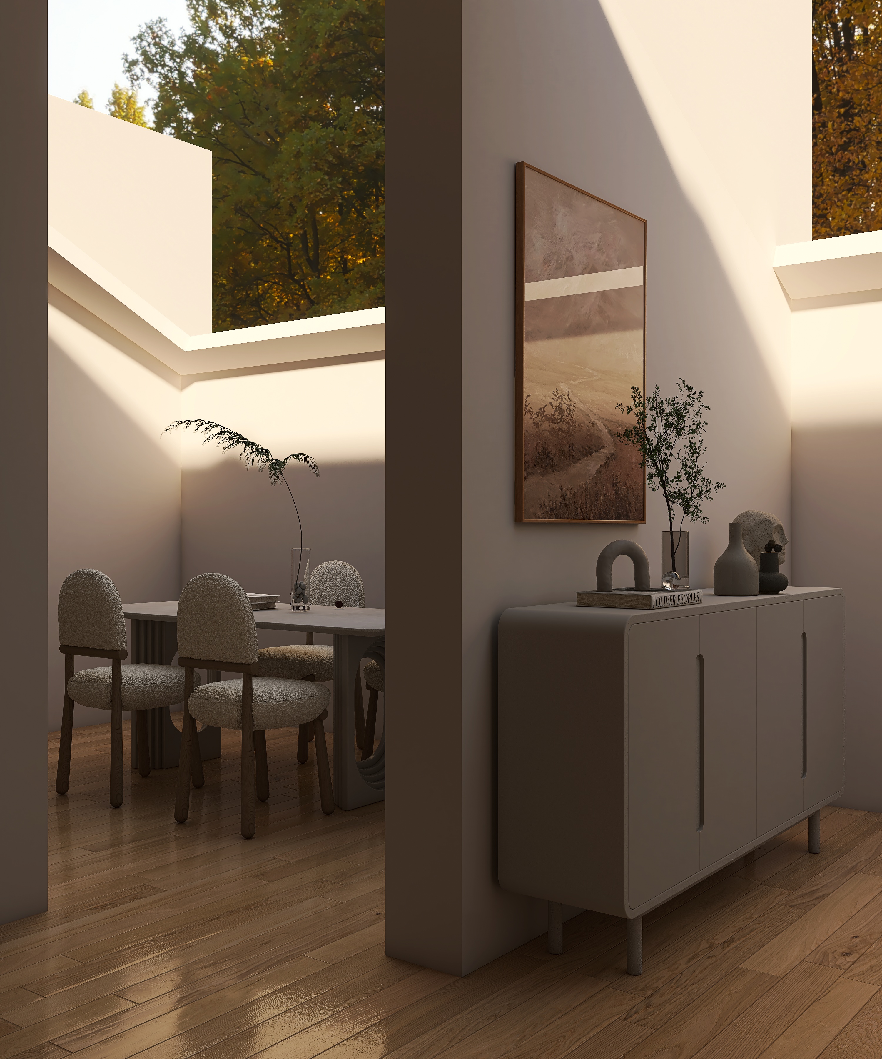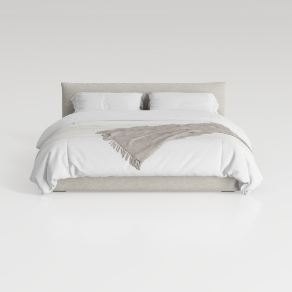 Designed with minimalist Scandinavian aesthetics, emphasizing clean lines and natural warmth. The textured linen headboard and softly draped white bedding create a calm, inviting atmosphere, balancing softness and subtle sophistication. Ideal for a serene bedroom, elevating modern cozy styles with understated charm. A generously padded headboard supports relaxation, while smooth, breathable fabrics ensure restful sleep.