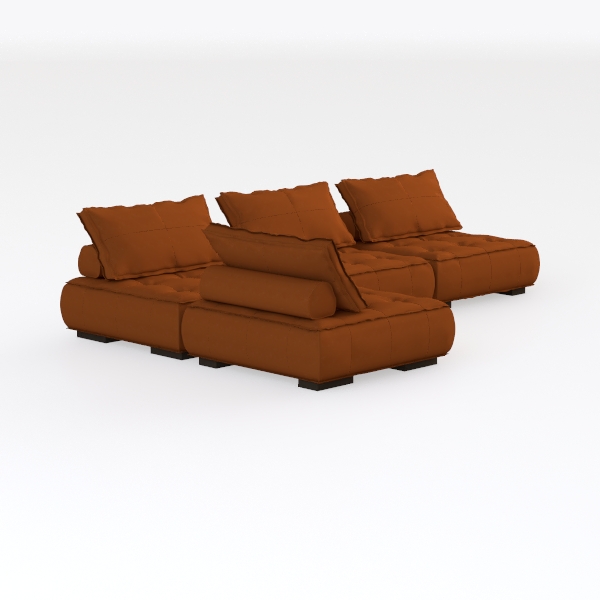 Designed to blend warmth and versatility, this modular seating ensemble takes cues from nature’s earthy palettes and mid-century modern simplicity. The rich terracotta hue of the upholstery feels like a hug, with a soft, velvety texture that invites gentle touches—its subtle sheen catching light to add depth without overwhelming. Clean, uncluttered lines and a low, streamlined profile keep the focus on the furniture’s organic flow, making it a timeless addition to any living space.