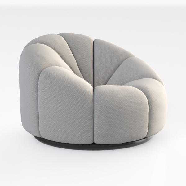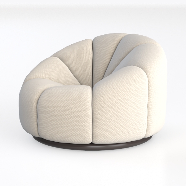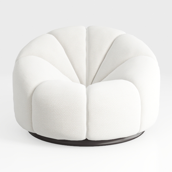 This striking armchair draws design inspiration from the delicate, organic curves of blooming flowers, where each petal-like section unfolds to cradle the body in gentle embrace. Crafted with a textured, soft fabric, its surface feels surprisingly substantial yet inviting—warm to the touch and offering just the right balance of plush comfort and subtle structure. The rounded silhouette, with its flowing, petal-shaped folds, creates a visually light, almost sculptural presence, while the crisp white hue infuses the space with a clean, airy energy. A low, contrasting black circular base grounds the piece, adding a touch of understated sophistication that complements its soft form.