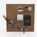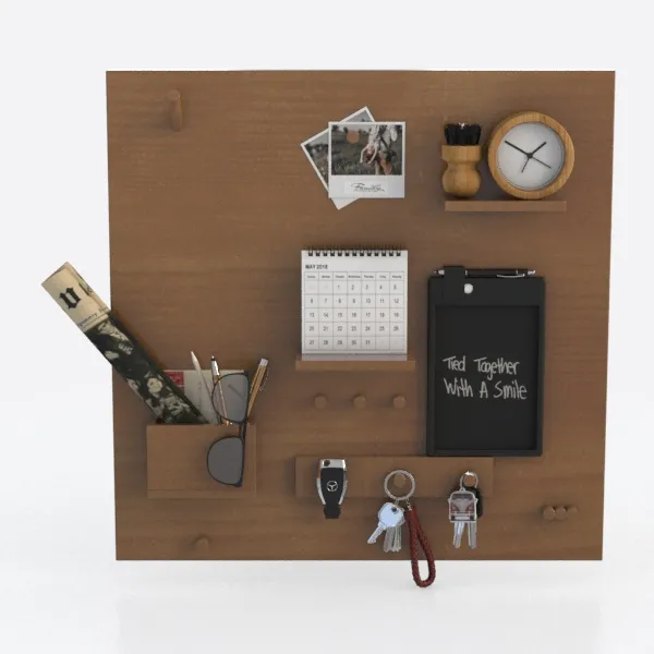 A 3D model of a wooden wall-mounted home office organizer, featuring wooden materials and minimalist functional aesthetic. It has low polygon count, suitable for home/office storage and organization.