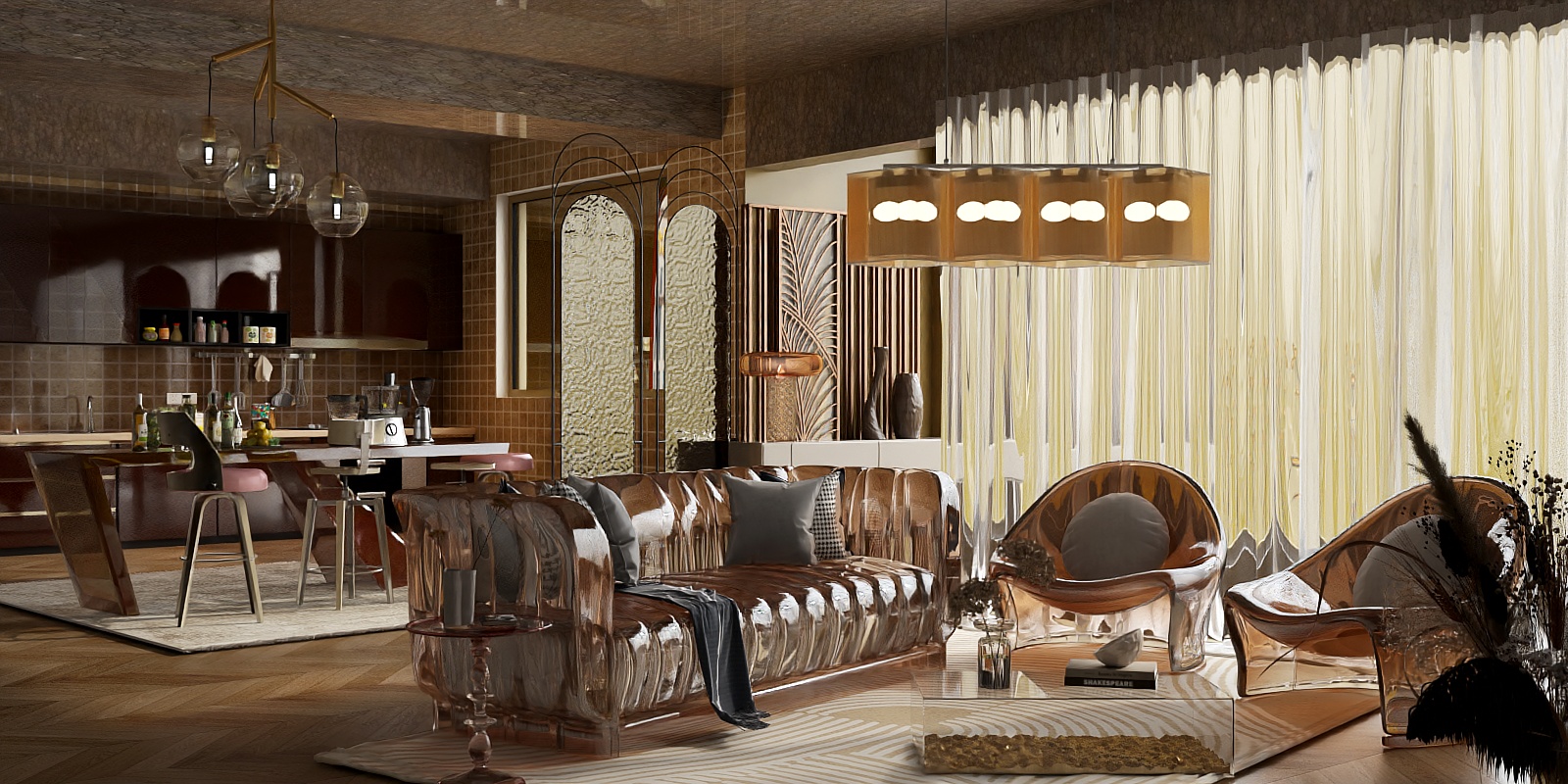 Designed to blend organic warmth with sleek modern lines, the piece features a rich wooden tabletop with subtle grain and angular metal supports. Soft pink upholstered bar stools with polished metal legs add femininity, balancing the robust texture. Ideal for a contemporary kitchen island or casual dining, it pairs with marble accents and geometric lighting. A generous width holds bottles, fruits, and appliances, while swivel stools ensure comfortable seating for gatherings.