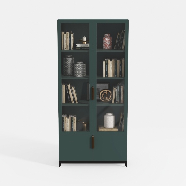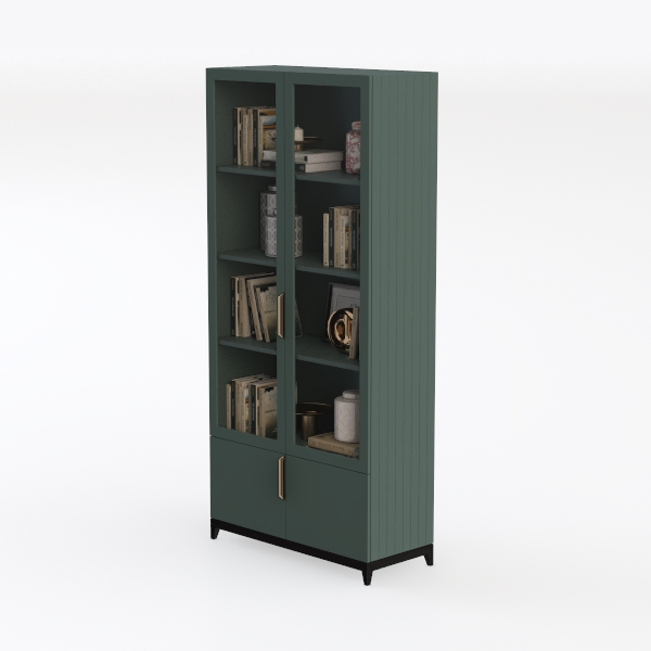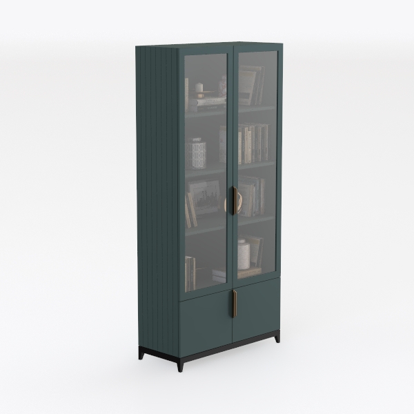 Inspired by organic textures and mid-century modern aesthetics, this elegant cabinet features a deep emerald-green matte surface with sleek gold metal handles. Transparent glass doors reveal neatly arranged books and decor, creating a balanced, inviting display. Ideal for modern, minimalist, or retro-inspired living rooms or home offices, it pairs beautifully with marble side tables and vintage lighting. Ample shelving and a lower closed compartment offer plenty of storage for books, collectibles, and essentials, blending functionality with timeless design.