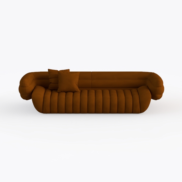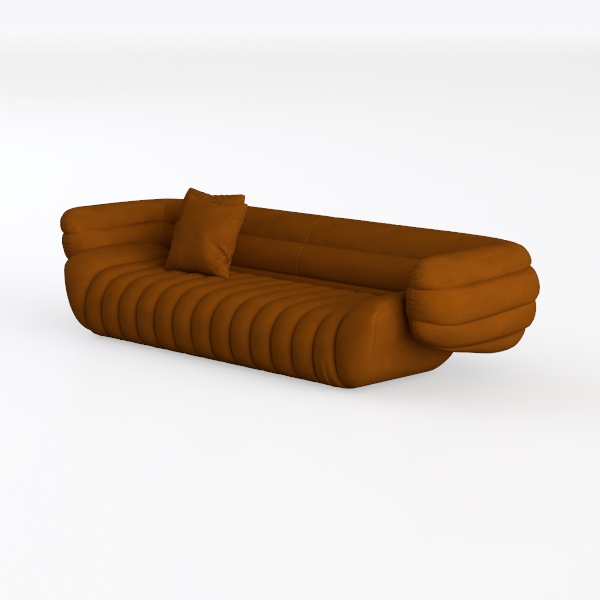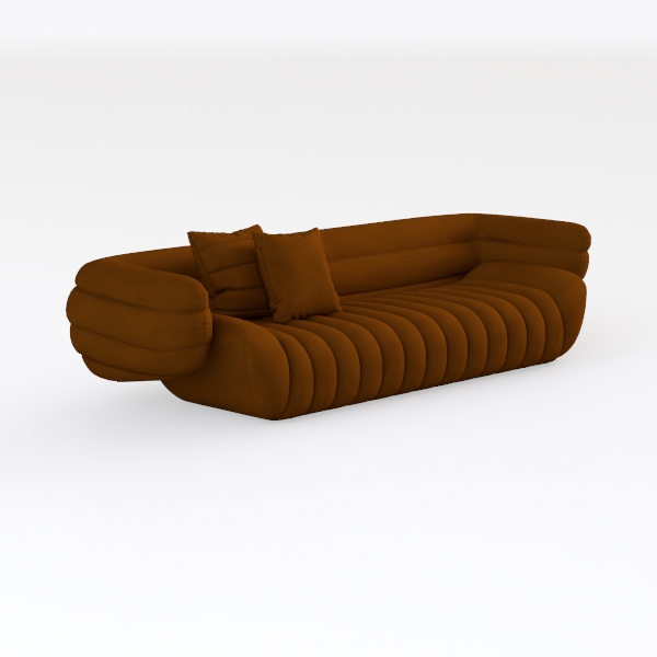 This sofa merges mid-century modern warmth with contemporary softness, inspired by the gentle, flowing curves of natural forms—think seashells or billowing silk. Its rich terracotta hue, like polished clay, radiates a cozy, grounded energy, while the tufted, ridged upholstery, crafted from a buttery-soft microfiber fabric, feels surprisingly plush to the touch. The rounded armrests and undulating seat pattern create a visually soothing rhythm, softening the space with organic, approachable lines.