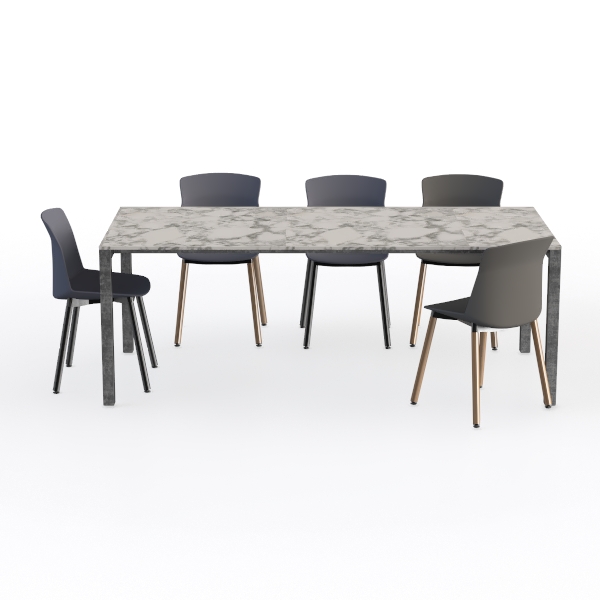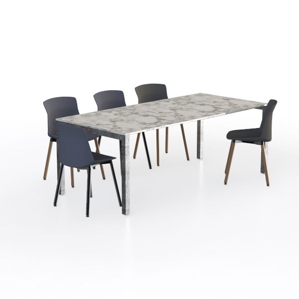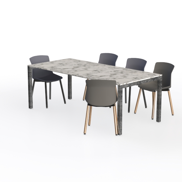 Inspired by natural stone, the table boasts a smooth, marbled surface with soft gray veining, paired with sleek, upholstered chairs and slim, warm-toned legs. Ideal for a modern minimalist dining room, it complements matte ceramic decor and potted greenery. The spacious tabletop fits 6, while contoured chairs offer ergonomic support for cozy family meals.