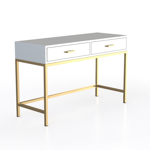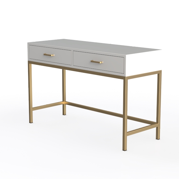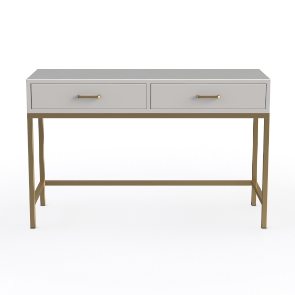 Inspired by mid-century modern minimalism, this console table merges clean lines with soft warmth. Smooth matte gray drawer fronts contrast beautifully with polished gold metal legs, creating a sleek, inviting visual. Perfect for modern or contemporary living rooms, pair it with marble side tables and brass lamps. Spacious double drawers offer ample storage, ideal for small entryways or beside beds.