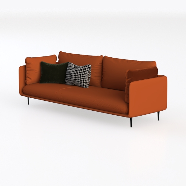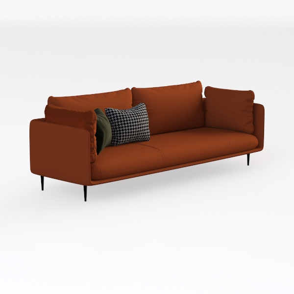 Designed to blend cozy living with modern aesthetics, this sofa draws inspiration from warm natural tones. The soft terracotta upholstery feels smooth, with plump, cloud-like cushions that cradle you in comfort. Black slender legs and clean lines add sleek minimalism, while green velvet and houndstooth pillows bring rich texture. Perfect for a contemporary living room, pair it with marble coffee tables and metallic floor lamps—ideal for unwinding after a long day.