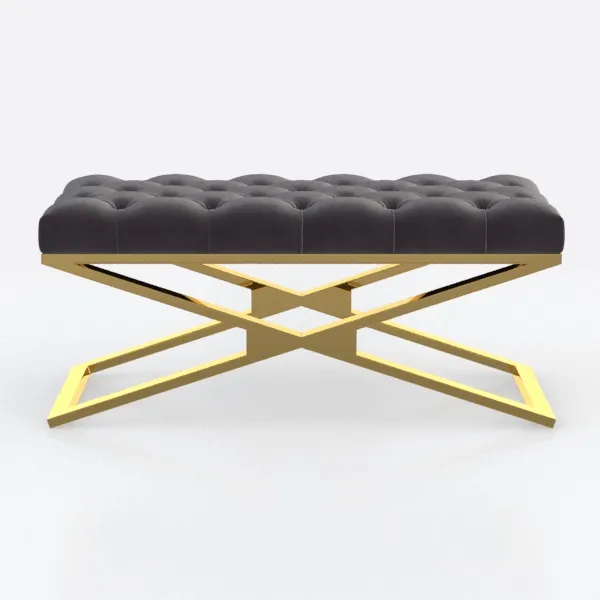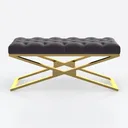 Inspired by the timeless allure of traditional upholstery craftsmanship reimagined for contemporary living, this piece marries the elegance of classic design with the clean lines of modern minimalism. The seat is wrapped in a plush, velvety matte black fabric, its deep button tufting creating a rhythmic, textural pattern—soft to the touch, it offers a sumptuous contrast to the sleek, structured elements above. Above this, a frame of polished gold-tone metal forms a striking X-shaped base, crafted with precision to balance lightness and stability; the reflective finish catches and diffuses light, adding warmth and a subtle glow to the overall aesthetic.