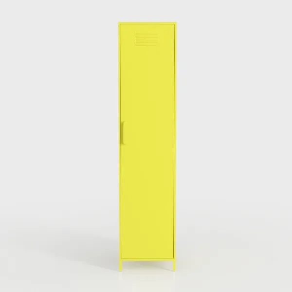 Inspired by mid-century industrial lockers with contemporary twists, this tall cabinet features a vibrant lemon-yellow matte surface—smooth, cool to the touch. Its sleek lines and compact frame add a striking focal point to minimalist or industrial spaces, pairing beautifully with wooden side tables and geometric rugs. With generous internal storage and top ventilation, it blends style and functionality seamlessly.