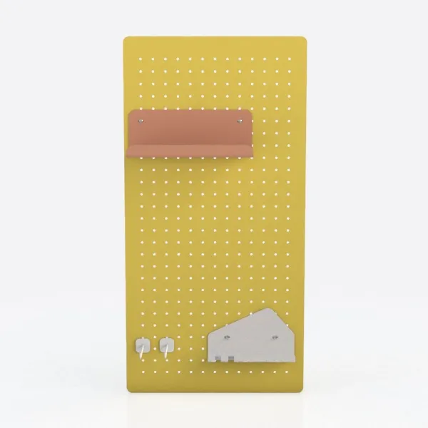 Functionality is key here: the mustard-yellow panel offers endless flexibility, allowing you to rearrange the pegs and triangular holder to suit your needs—whether hanging cooking utensils, office tools, or small potted plants. The leatherette shelf provides a stable surface for displaying books, photo frames, or decorative objects, while the metal components ensure durability and a touch of understated elegance. Together, they turn a simple wall into a dynamic, functional focal point, making it a versatile addition to any space.