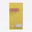 The base features a warm, matte mustard-yellow metal panel, its surface dotted with evenly spaced holes that add a subtle textural contrast. A smooth, rust-brown leatherette shelf is mounted at the top, its soft edges complementing the panel’s structured grid, while two small, silver metal pegs and a triangular gray metal holder—with a gently curved front—dangle from the holes, ready to cradle small items. The overall look is sleek yet inviting, with the vibrant yellow providing a cheerful backdrop to the muted tones of the accessories.