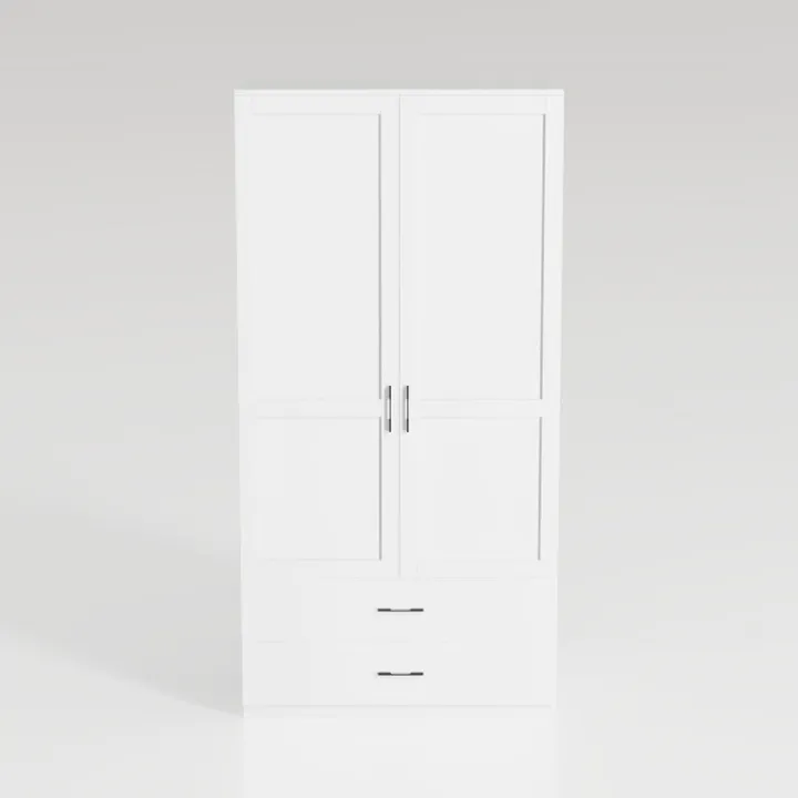 Crafted with minimalist Nordic design in mind, this piece blends clean lines and understated elegance. Its smooth, matte white finish radiates crispness, while a cool, tactile surface adds subtle depth to any space. Ideal for modern bedrooms or walk-in closets, it pairs beautifully with warm wood accents and sleek metal hardware. Spacious double doors and two drawers offer organized storage, merging style and practicality effortlessly.