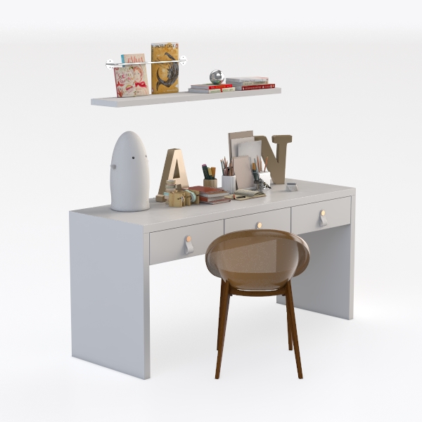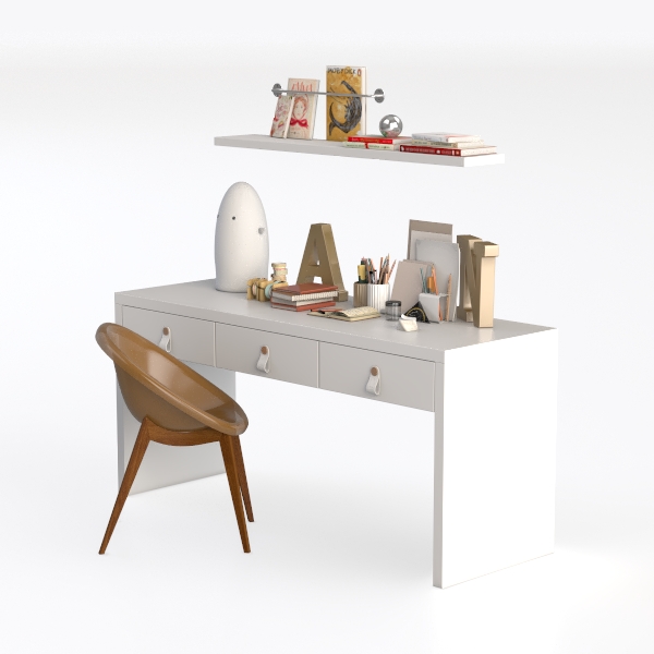 Perfect for a modern home office or a cozy bedroom nook, this setup thrives in spaces with neutral tones, allowing the desk’s crisp white and the chair’s rich brown to stand out. It pairs beautifully with marble accents, soft pastels, or potted greenery to add depth. Beyond its aesthetic appeal, the desk’s three drawers provide hidden storage for essentials, while the spacious surface easily accommodates a laptop, a lamp, and cherished trinkets, making it a versatile piece that balances style and daily utility.