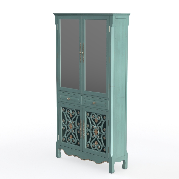 Perfect for a new classical or vintage-luxe living room, it serves as a focal point when paired with marble-topped side tables and brass table lamps, its teal hue harmonizing beautifully with neutral-toned sofas and wooden floors. Functionally, the glass doors offer a display space for porcelain figurines or glassware, while the carved lower panels—fitted with hidden storage compartments—provide discreet spots for smaller items like coasters or stationery. The sturdy wooden construction ensures durability, making it both a decorative statement and a practical addition to daily life.