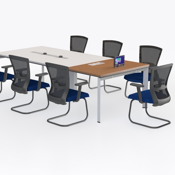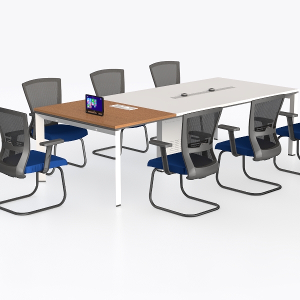 Designed with the ethos of fostering focused collaboration, this set draws inspiration from the balance of productivity and comfort, ensuring both individual concentration and seamless team interaction. The rectangular tabletop features a warm, natural wood grain surface, smooth to the touch and exuding a sense of warmth, while the sleek white metal legs add a modern, uncluttered look. The chairs, upholstered in vibrant blue fabric with a breathable mesh backrest, offer a soft yet supportive feel—their contoured design fits the body perfectly, reducing fatigue during long meetings.