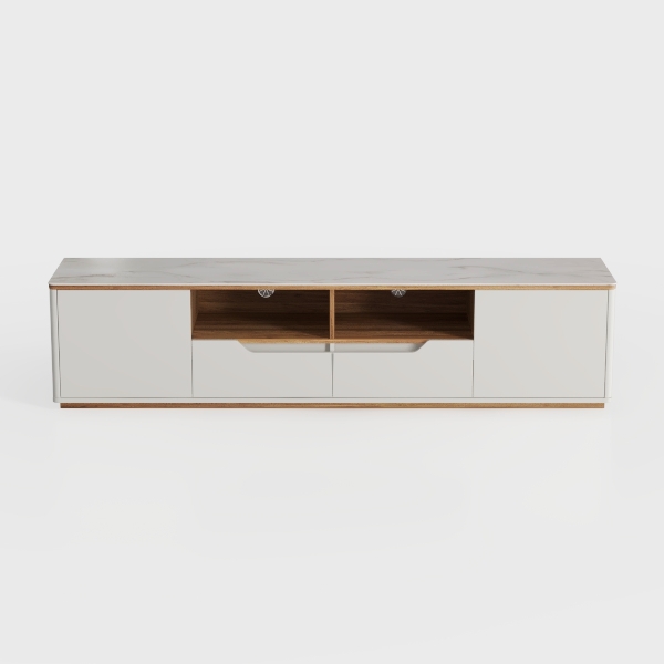 Inspired by the harmonious blend of natural textures and minimalist architecture, this furniture piece exudes modern elegance. Its exterior features sleek, matte white cabinetry with a subtle glossy finish that reflects soft light, creating an airy feel. The top surface mimics the delicate veining of premium marble, adding a touch of luxury, while the warm oak interior of the central open shelf introduces organic warmth, balancing coolness with natural coziness.