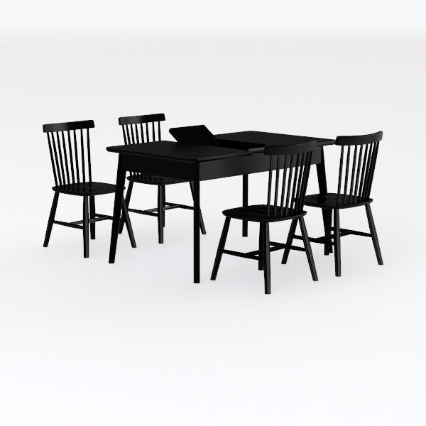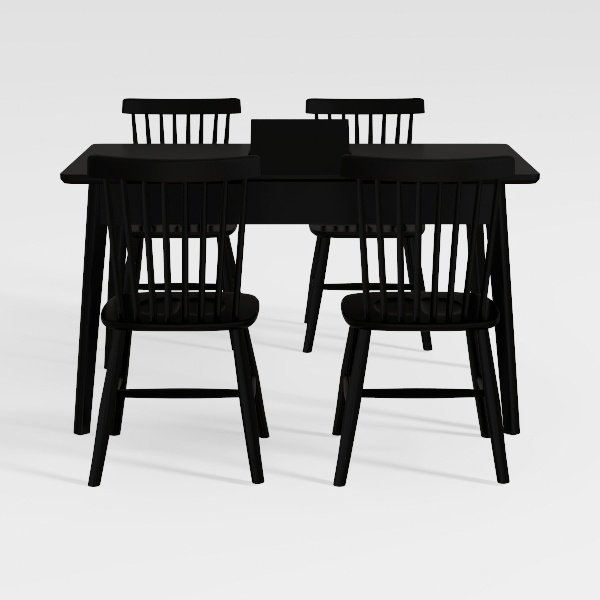 Crafted from smooth, high-grade solid wood, the tabletop boasts a matte black finish that catches light softly, avoiding harsh glares. Its surface feels cool yet warm to the touch, offering a tactile contrast between the smooth wood and the subtle texture of the slatted chair backs, which are gently curved to cradle the body for comfortable seating. The overall aesthetic is clean-lined and modern, with black’s neutrality creating a calm, sophisticated backdrop that feels both timeless and fresh.