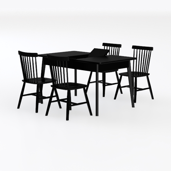 Rooted in Scandinavian design philosophy, this dining set embodies the essence of "less but better"—a harmonious blend of functionality and understated elegance. The collection features a rectangular table with crisp, unadorned edges and tapering, angular legs that exude lightness, paired with four slender-back chairs that echo its geometric precision.