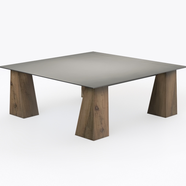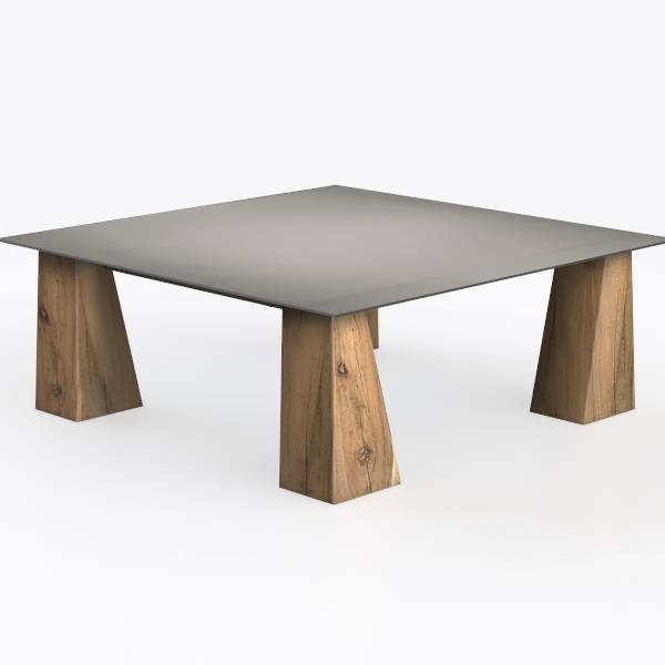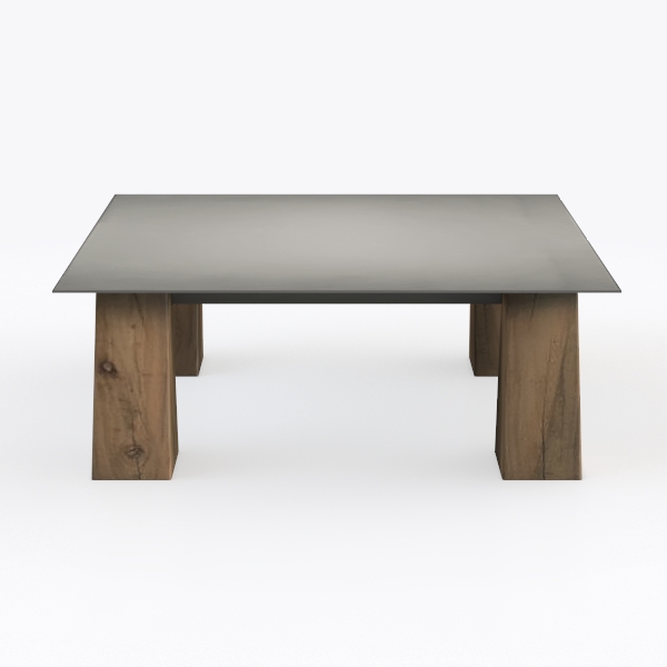 Crafted with a blend of organic warmth and geometric precision, this table draws inspiration from the balance of natural elements and modern minimalism. Its tabletop features a smooth, matte surface—likely polished stone or metal—with a cool, muted gray hue that contrasts beautifully against the robust, weathered wooden legs. These legs, with their visible grain and blocky, grounded design, add a tactile, earthy presence, while the overall form feels both substantial and uncluttered.